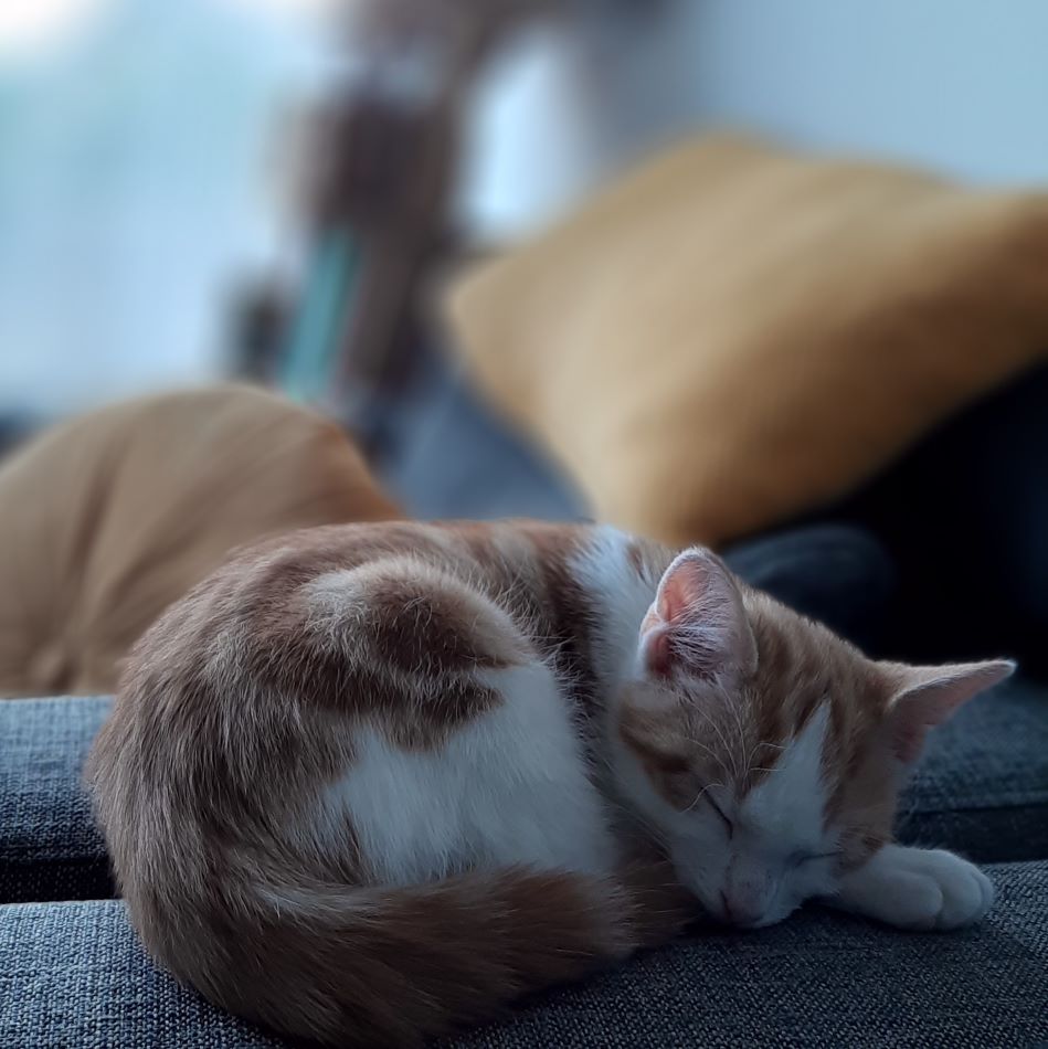 Vanaf de geboorte van de jongste hebben we geen huisdier meer gehad, totdat ik na de scheiding in mijn appartement ging wonen en er in de balkondeur al een kattenluik zat en mijn zoon, toen 12 jaar) dit een mooie aanleiding vond om mij wekelijks aan mijn kop te zeuren voor een kat! Toen een vriend een nestje had met een rode kater (eerst dachten we een poes) ging moeders overstag en zo heeft lieve therapeutische kat James zijn plekje ingepikt in huize Zettje.ย